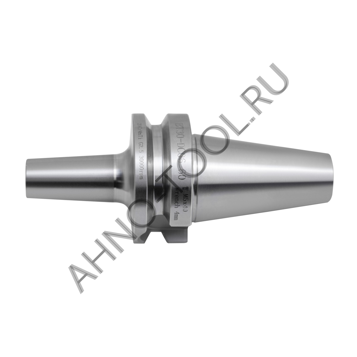 BT30 – предназначен для крепления на станках ЧПУ, и имеет специальный поясок для захвата механической рукой. Конус выполнен по Японскому стандарту и отличается тем, что имеет длинную конусную часть и посадка в шпиндель осуществляется только по конусу. Из-за длины конус ВТ держит поперечные и осевые нагрузки значительно лучше, чем конус HSK, но имеет менее точное позиционирование, так как в качестве опорной поверхности выступает только конус без пояска на торце.